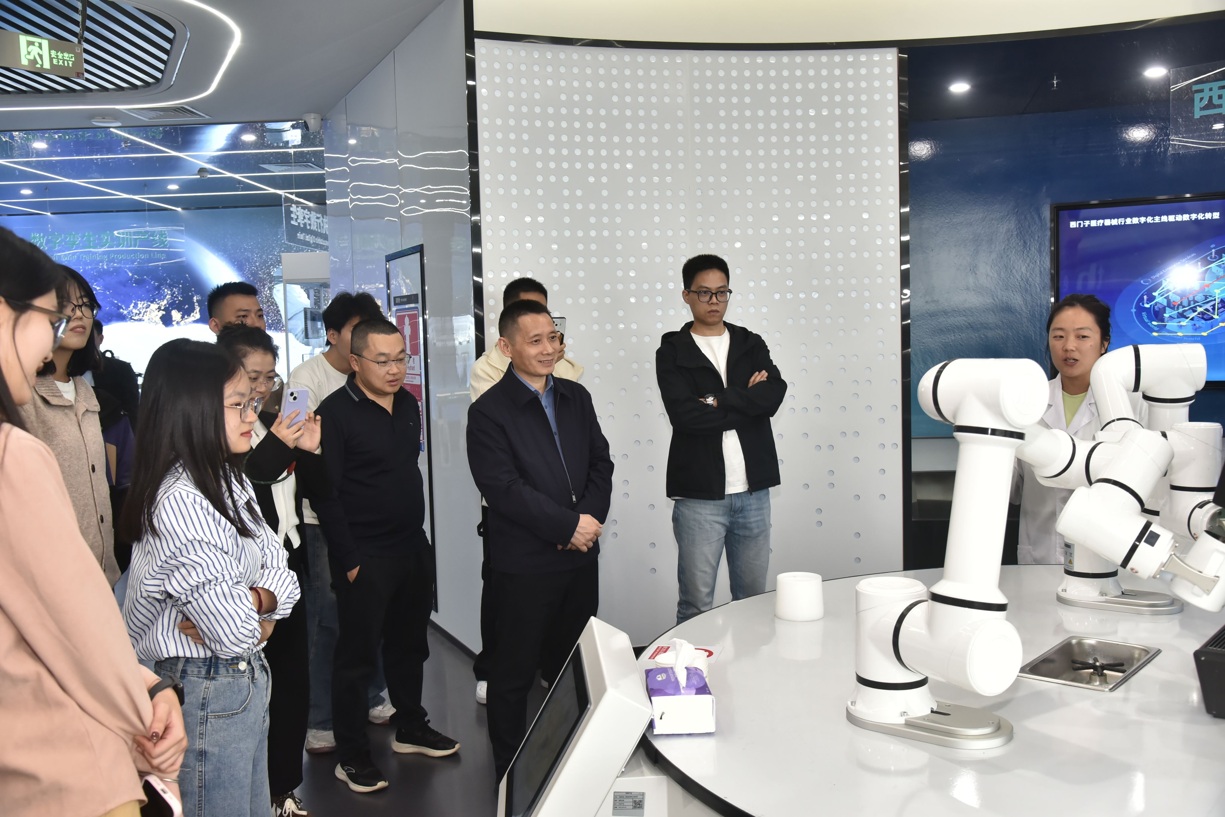 在天泽教育公司,研究生与行业导师围绕教育数据挖掘展开交流,行业导师结合教学实例讲解数据在教育质量提升中的作用,并参观了位于光明科学城西门子数字化工业创新中心。如何人工智能科技公司向同学们展示了 AI 与统计结合的前沿应用。导师们与研究生探讨技术发展趋势,鼓励大家深耕交叉领域、锤炼复合能力;以后到公司学习的研究生们将获得接触 AI 统计前沿项目、参与技术研发的宝贵机会。